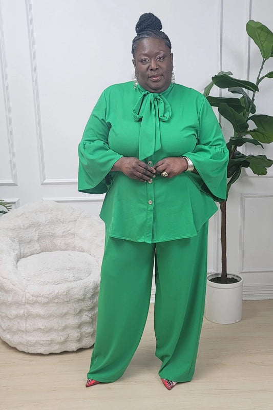This elegant two-piece suit in vibrant Kelly green features a tailored waistline that enhances your...