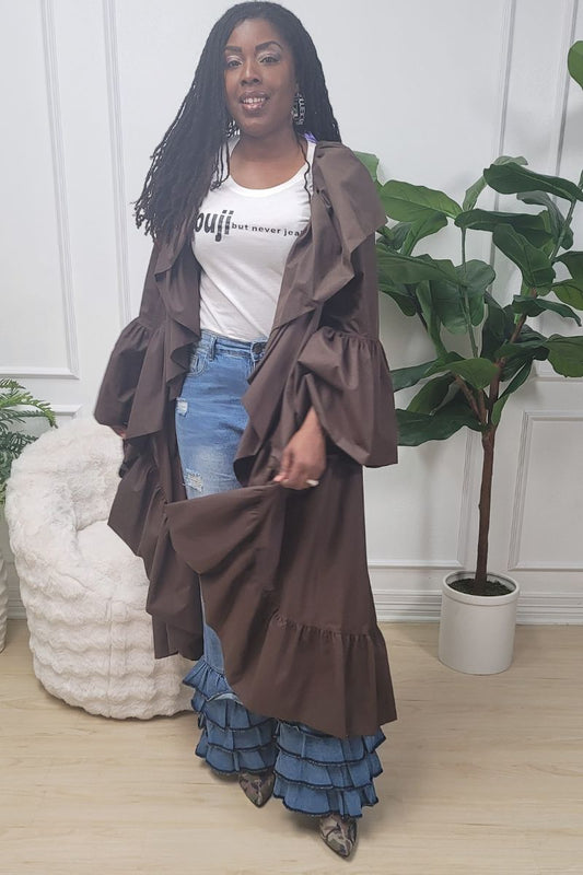 Elevate your wardrobe with this elegant chocolate ruffle duster, designed to add sophistication without weight....