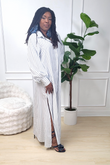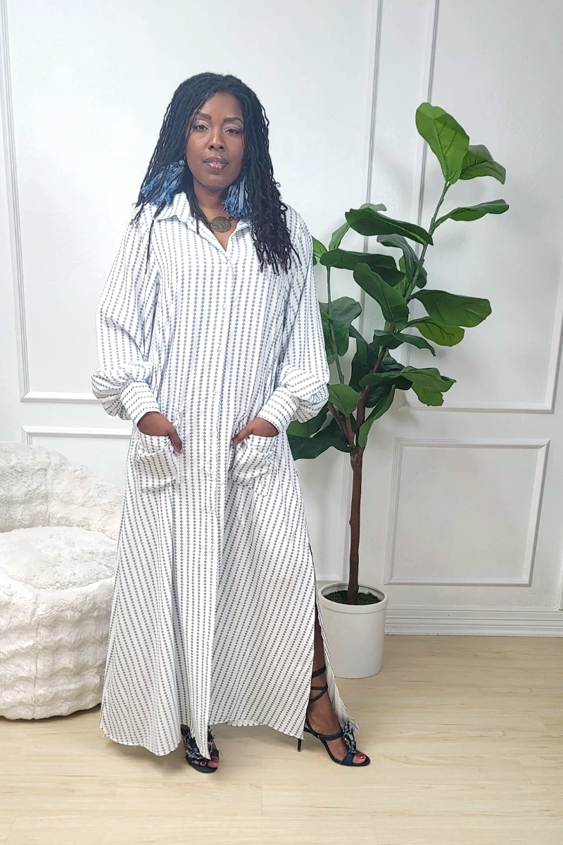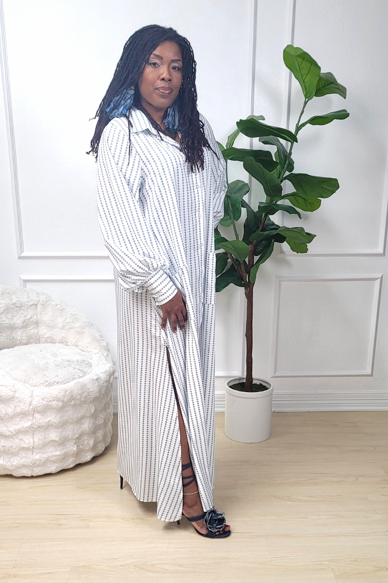 The Breezy Button-Down dress offers a sophisticated floor-length silhouette enhanced by deep side slits for ease of movement. Its blue diamond accents add a refined touch, complementing the wide button cuffs that emphasize classic tailoring. This dress is ideal for those seeking a polished yet comfortable look with expert detailing.
