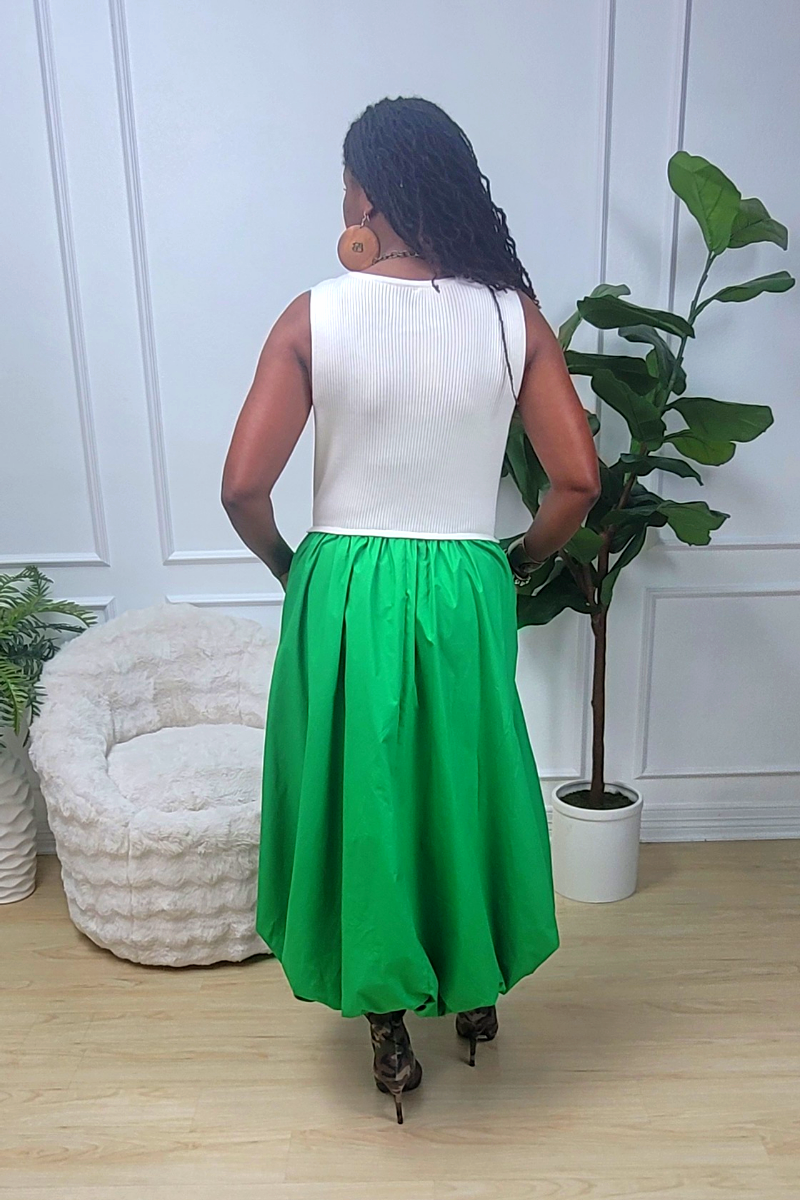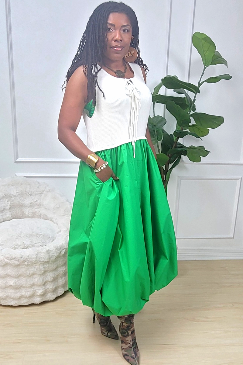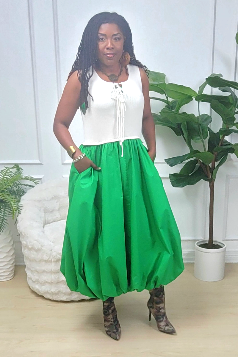 Elevate your wardrobe with this Kelly-green bubble maxi dress, featuring a flattering silhouette that adds volume and movement for a stylish statement. Paired with a cream no-sleeve top that ties in the front, this ensemble offers a balance of bold color and soft elegance, ideal for versatile layering and sophisticated looks. Perfect for warm weather or transitional seasons, these pieces combine comfort with expert design details to enhance your everyday style.